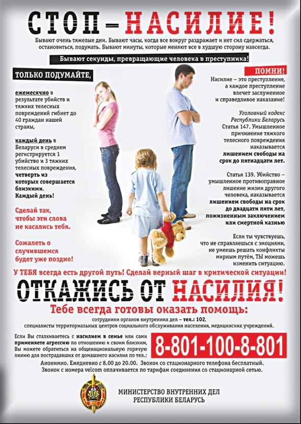 «Откажись от насилия!» Под таким девизом 18 - 19 сентября 2013 года пройдет республиканская профилактическая акция. Ее основная цель - широкое освещение проблемных вопросов, связанных с совершением тяжких и особо тяжких преступлений против жизни и здоровья, для формирования высокого уровня законопослушания, создания условий максимальной защищенности граждан.