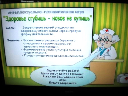 22 ноября, в шестой школьный день, в рамках месячника по здоровому образу жизни, социальный педагог Пасюкова В.А. провела интеллектуально познавательную игру «Здоровье сгубишь - новое не купишь» с учащимися пятых классов. Две команды «Диролики»( 5 «А» класс) и «Чистюли» (5 «В» класс) показывали свои знания, смекалку и находчивость в конкурсах: «Правила питания», «Лук от семи недуг», «Медицинский», кроссворд «Здоровье», «Противотабачная викторина». Все ребята активно участвовали в игре. В результате, с разницей в один балл, победила команда 5 «В» класса.